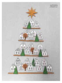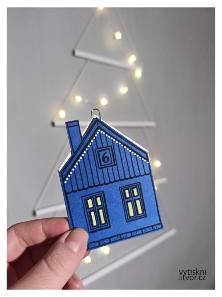 Můžete rovnou všechny domečky rozvěsit drátěnými háčky na jehličnatou girlandu, kolíčky na provázek, magnety na lednici, na nástěnku,... Taky se mohou odkrývat postupně – každé ráno děti objeví nový domeček na různých místech po bytě. Nebo u adventního skřítka?